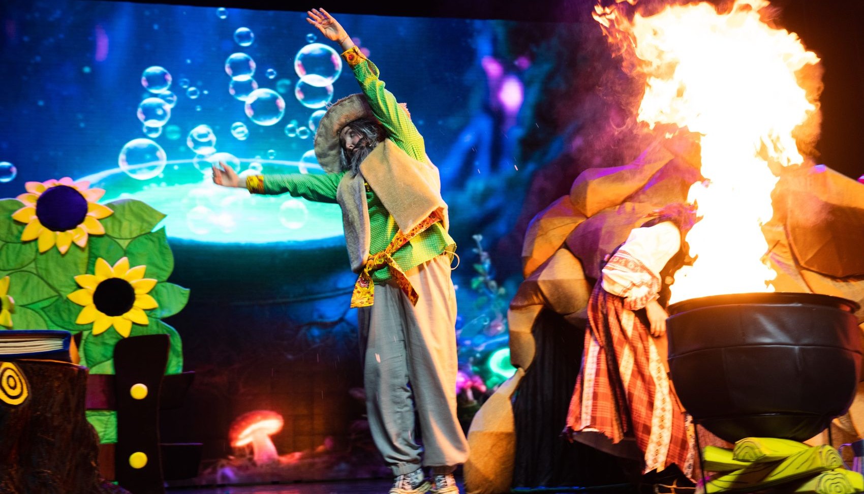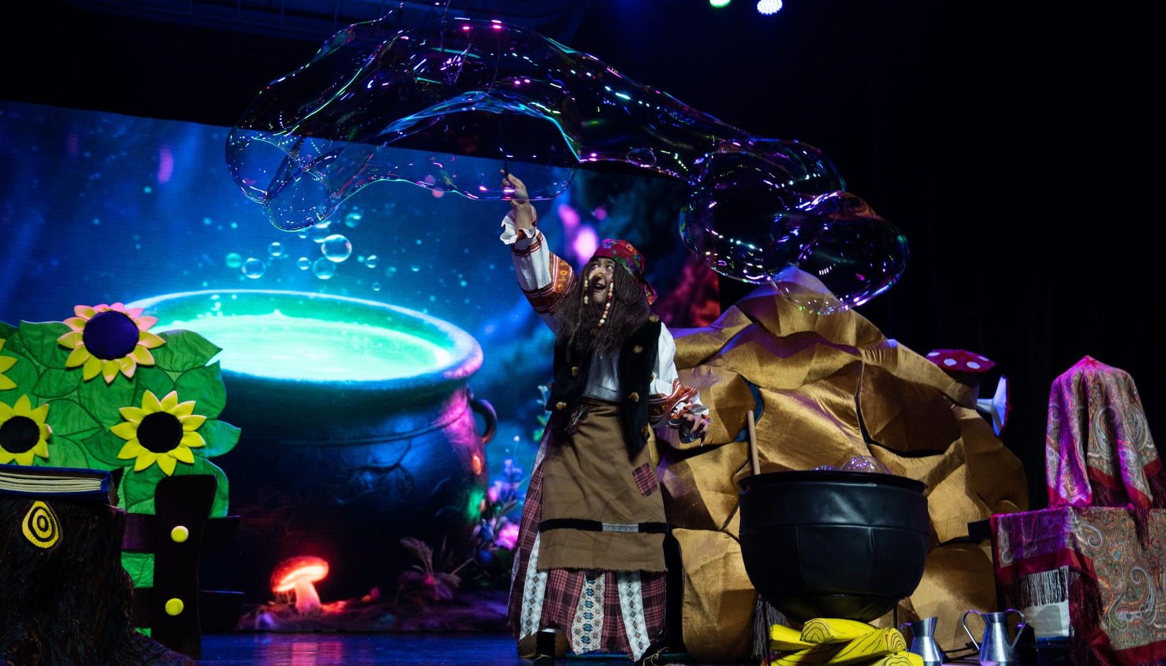 В нашем спектакле вы встретите настоящую магию, где в котле делает химические опыты «Баба Яга», большие молнии от «Тесла» машины, необычные появления на сцене, завораживающие мыльные пузыри и много маленьких чудес.